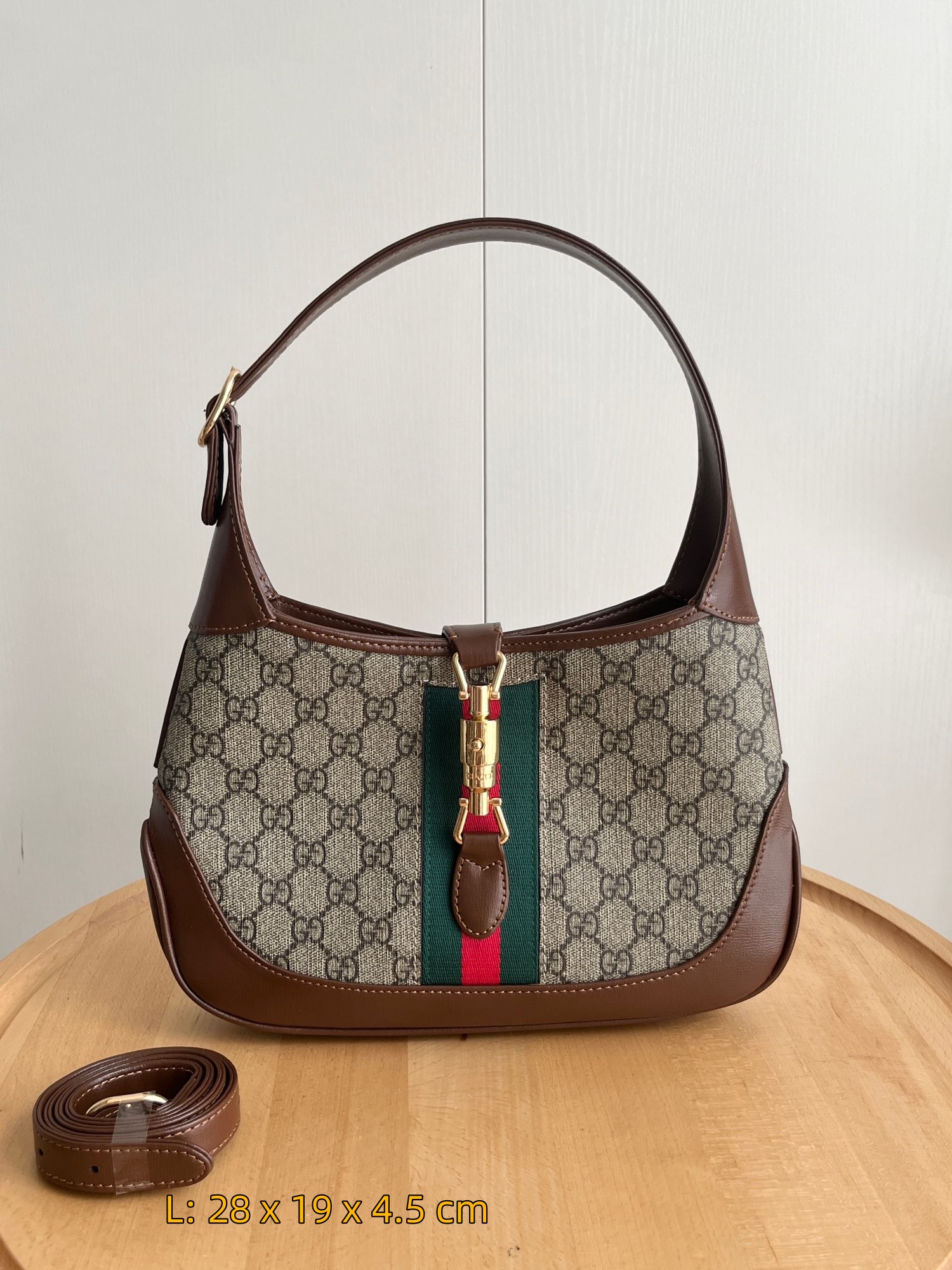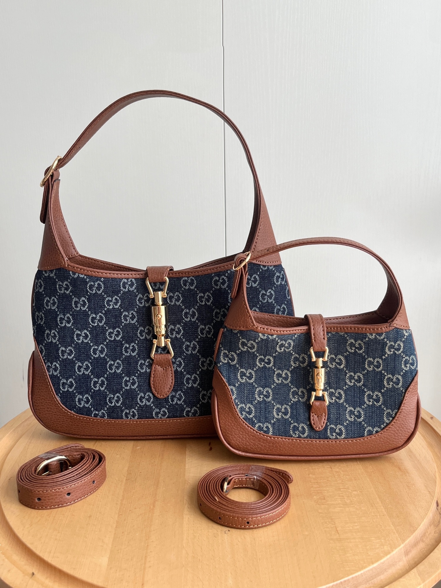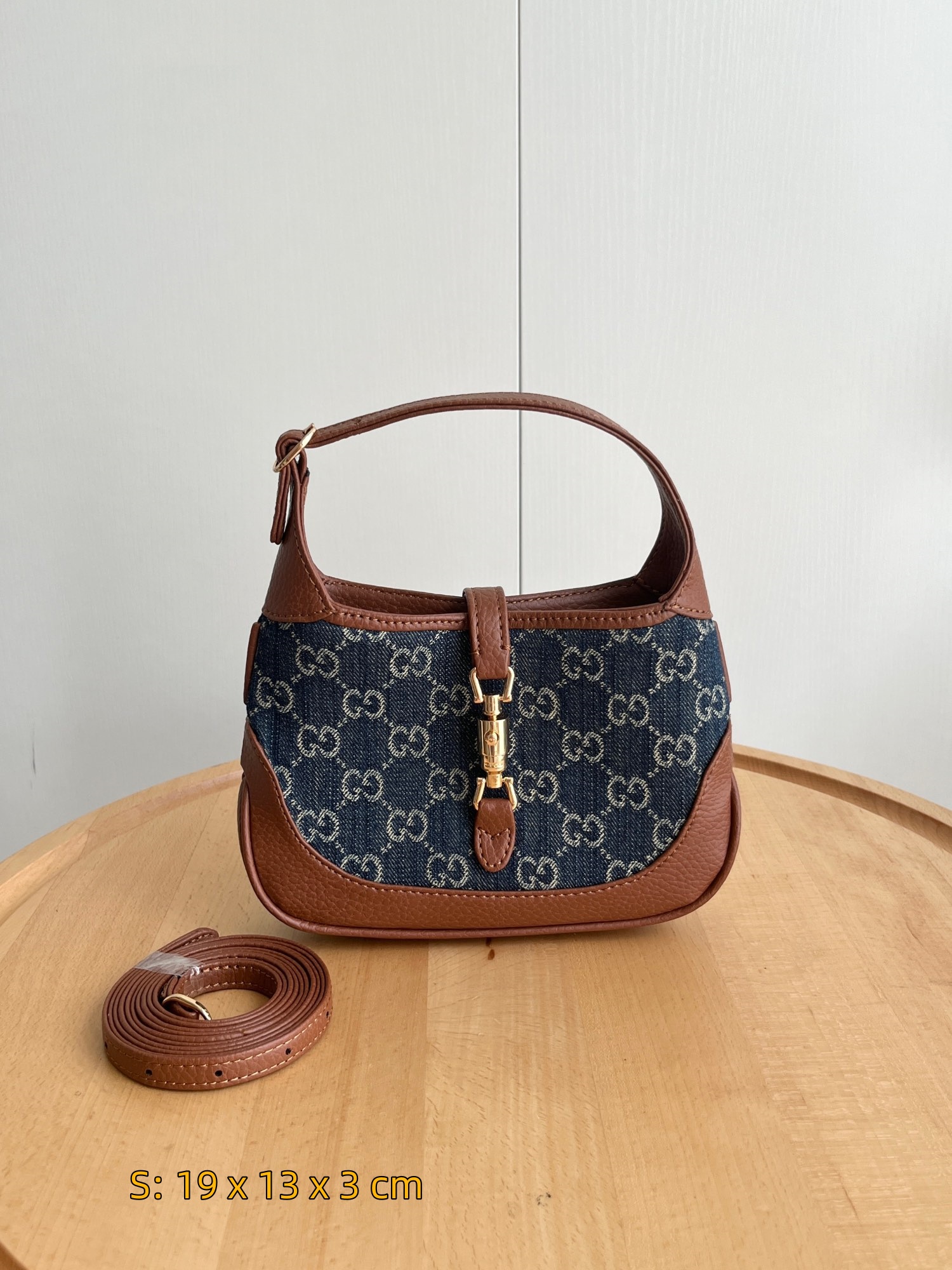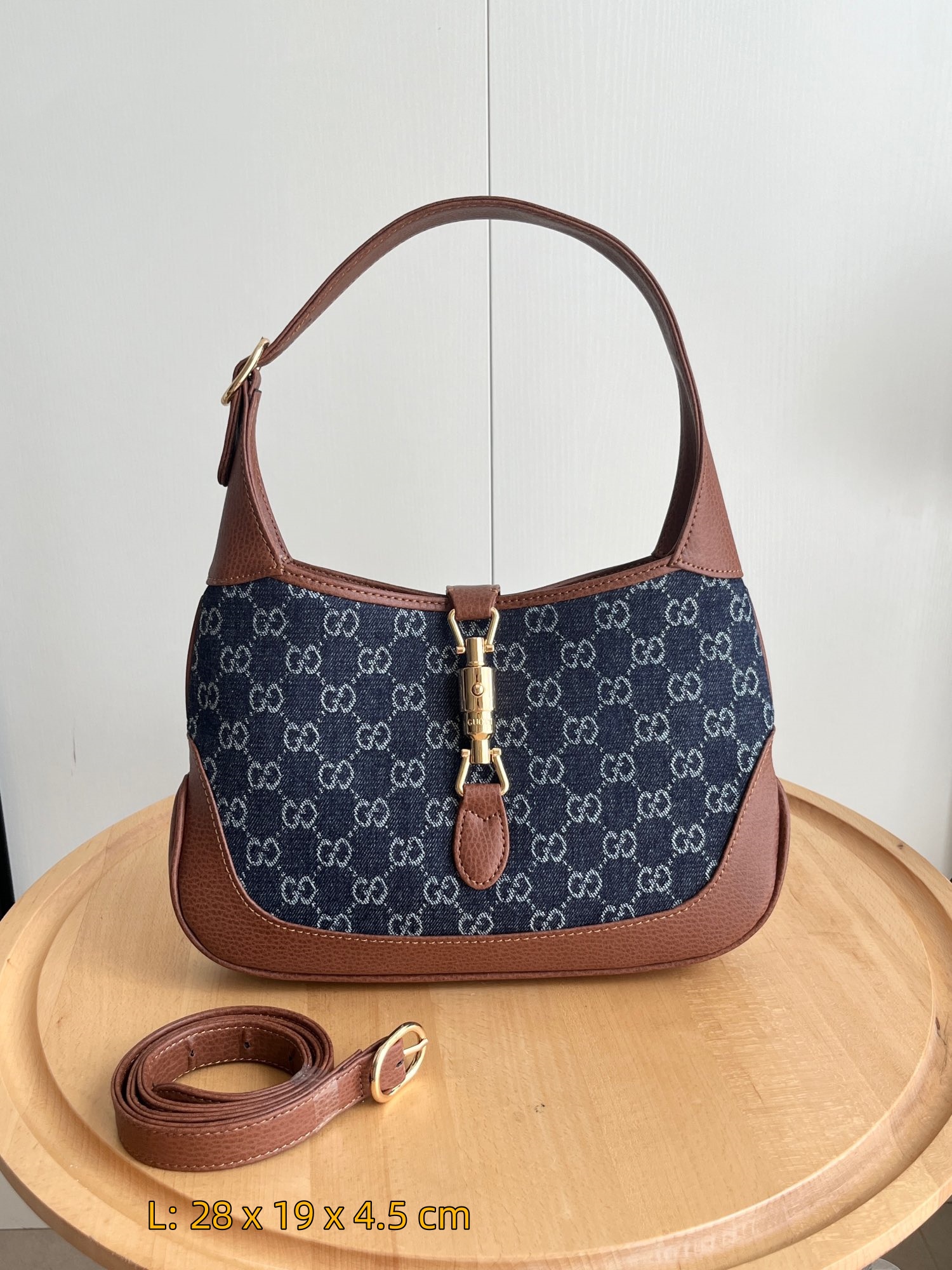Introducing the latest runway sensation: the GG Jackie 1961, a stunning blend of vintage charm and modern versatility. This unisex design features a striking combination of rich brown cowhide leather and durable blue waterproof denim, accented by an exquisite and unique lock closure. The detachable shoulder strap allows you to effortlessly switch between a chic shoulder bag and a practical crossbody, making it the perfect accessory for any occasion.